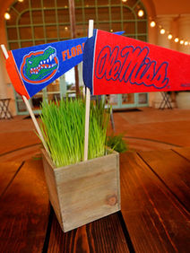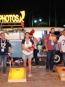 Tailgating Central was the most anticipated networking event of the Aptean Users Conference. Right On Pointe managed this event and coordinated logistics with a DMC to transform the atmosphere of the hotel’s porte-cochere into a sports themed experience with local food trucks, pickup truck tailgates used as bars, string lights and collegiate pennant centerpieces. Attendees sported their favorite team’s jersey, which sparked new relationships, as well as friendly rivalries. There were multiple themed food stations, including a potato bar with all the toppings, a walking taco & nacho station, grab & go favorites from the smoker & grill, and make your own ice cream sundaes. Guests were thoroughly entertained with tailgating games such as corn hole, football tire toss, life sized beer pong, giant Jenga and a vintage VW bus, which was converted into a photo booth. Overall, it was a memorable evening event full of fun, food and games!